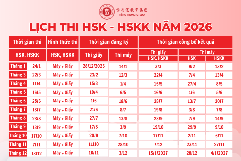 Lịch thi chứng chỉ HSK và HSKK năm 2026 đã chính thức được công bố. Dưới đây là thông tin mới nhất về lịch thi HSK/HSKK được tổng hợp bởi QTEDU, lưu lại ngay để lên kế hoạch cho kỳ thi sắp tới nhé.